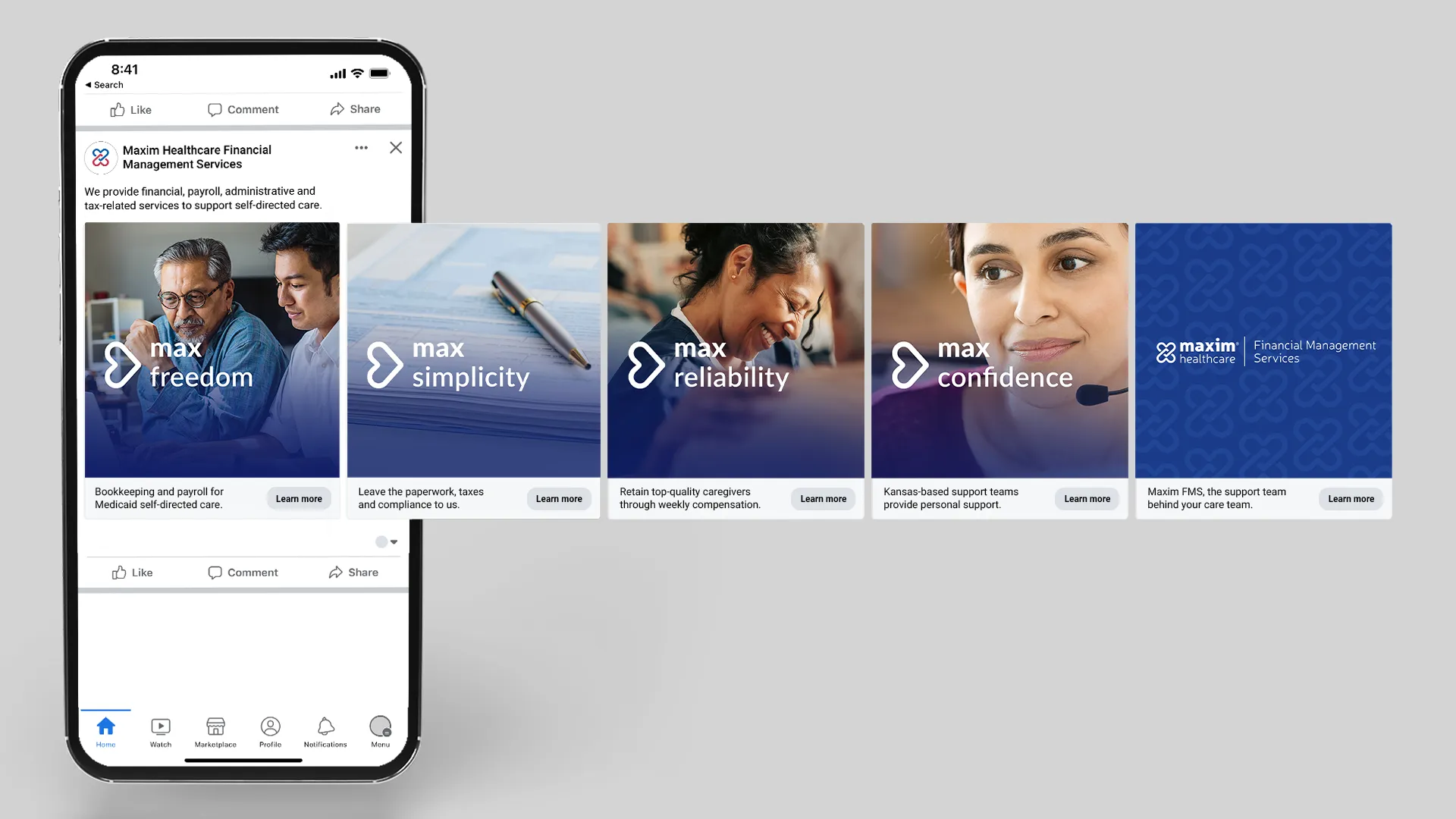 Maxim Healthcare, a misson-driven national company dedicated to making a meaningful impact in its local communities, needed to bring new energy to its marketing across all channels. The new CMO engaged Genesis to provide Maxim with a new visual voice, messaging and narrative that would communicate the company's unique "servant-leadership" culture and dedication to improving the lives of those needing care.Genesis initially created a name, identity, web design and advertising for a separate "Companion" business, called Villi, and in the process created a "brand architecture" for Maxim to ground new business ideas in that system. Then Genesis designed and implemented the new corporate and behavioral care websites, as well as an interim website for the company's new Financial Management Services (FMC) offering, all positioned on the human value of peace of mind. Genesis also provided clinic design and advertising for paid and social media for Maxim's behavioral and FMC businesses, thus creating a "look and feel" that can be applied to other parts of the business.